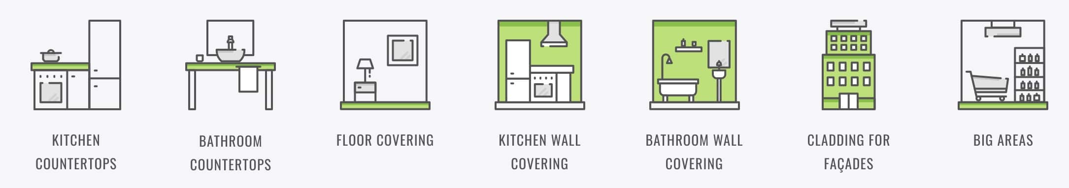 The unalterable porcelain slabs mimic marble in their aesthetic quality but are resistant to stains and extreme temperatures. This makes it ideal for kitchen and bathroom countertops, floor and wall coverings, and exterior building/residential facades.