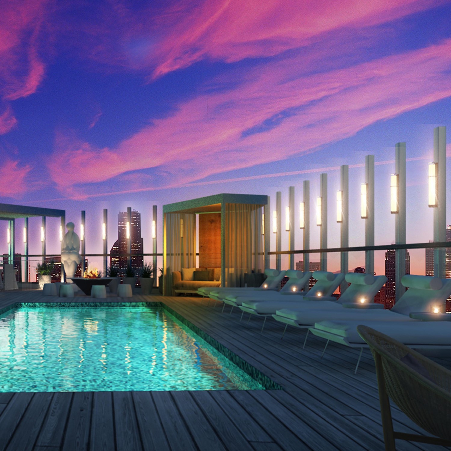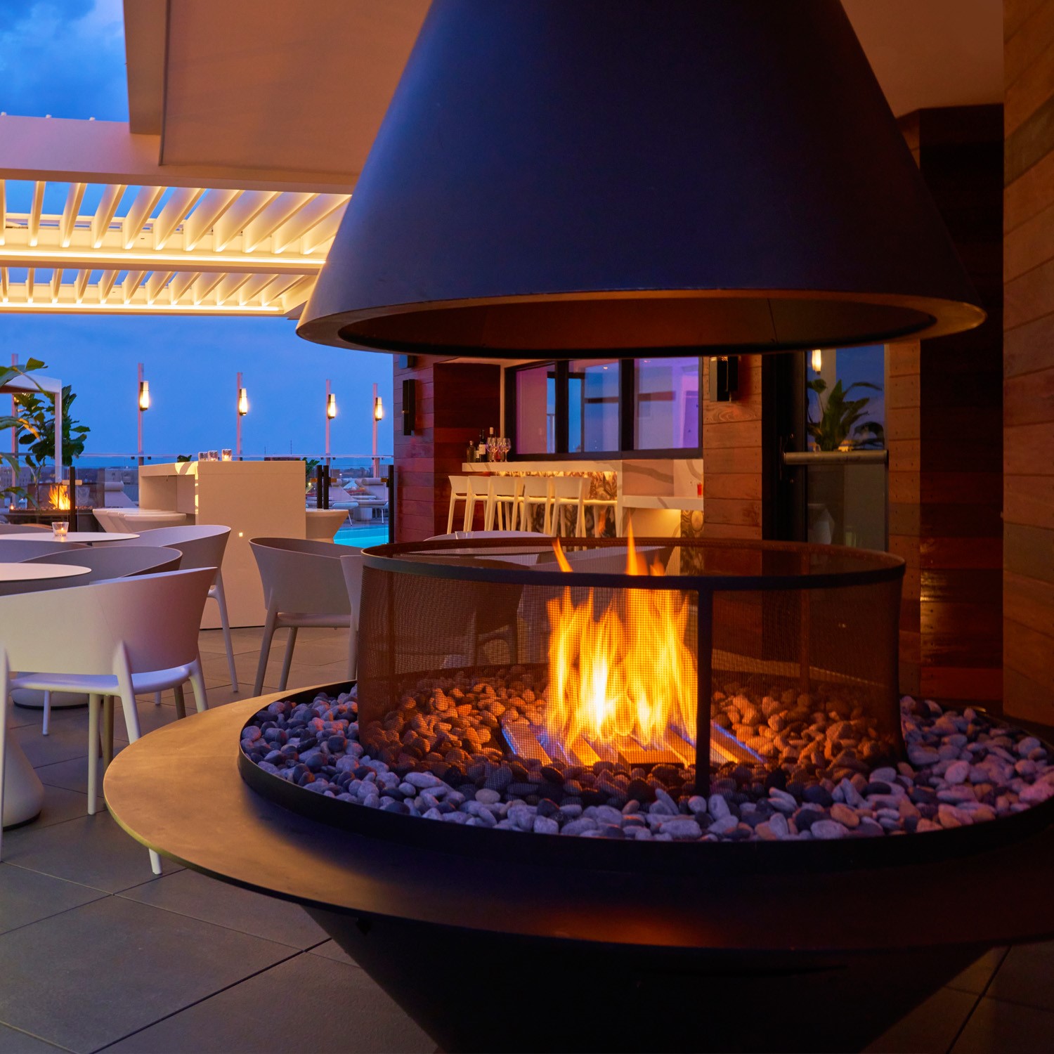 Featuring large modern rooms with a split focus on work and play, the hotel for the traveler that thrives on inclusivity. Hotel Zena features some beautiful amenity spaces including a large rooftop pool deck + bar where you will find two completely custom fabricated round Montigo firepits.