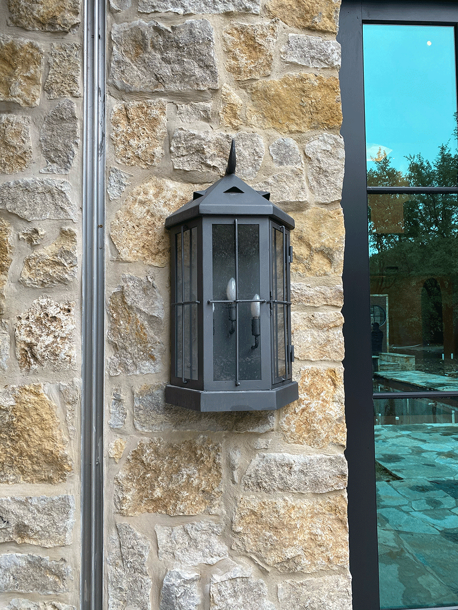 Simple, yet intriguing, the Sosha custom lighting family features a geometric influence to its transitional design. Four glass panels with geometric overlays give the look of traditional four-split windowpanes, for a total of 16 individualized panes throughout the entire lantern. A basic pyramid-shaped topper with simple peephole embellishments finishes off the light for a unique illumination. Ideal for driveways, entryways and patios, this lantern offers simple sophistication to any transitional property.