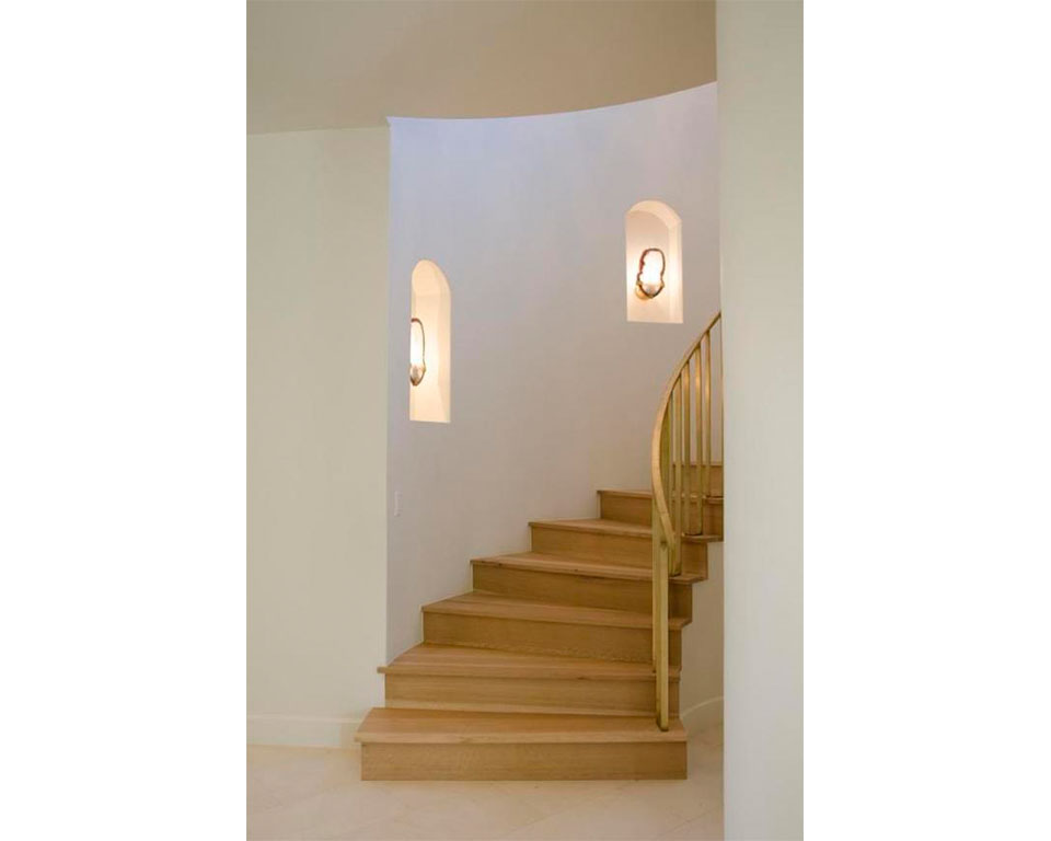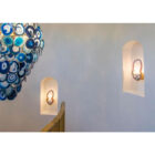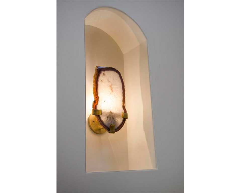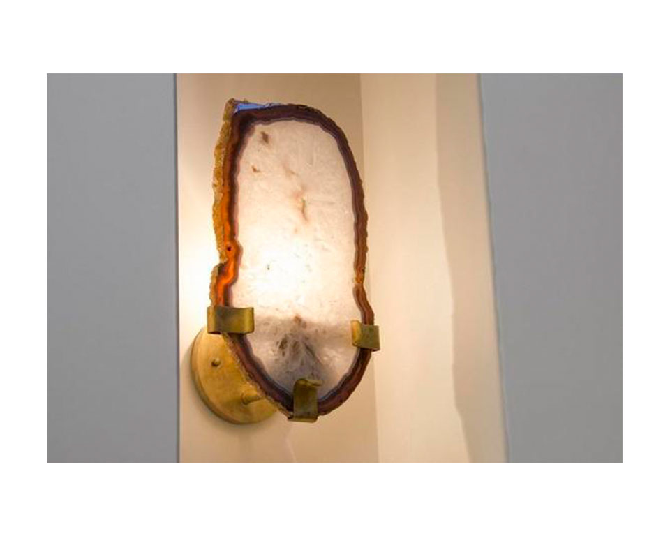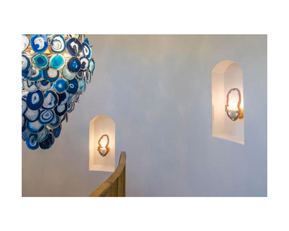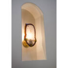 Agate is a quartz crystal that captures the imagination with its distinctive grain and vivid colors. Solara’s Agate wall sconce comes in brown or blue, and each stone is rimmed in gold by hand. This sconce is a conversation piece in a foyer, stairwell, living room, or any other area where you desire a contemporary lighting accent.