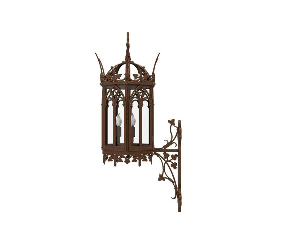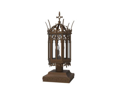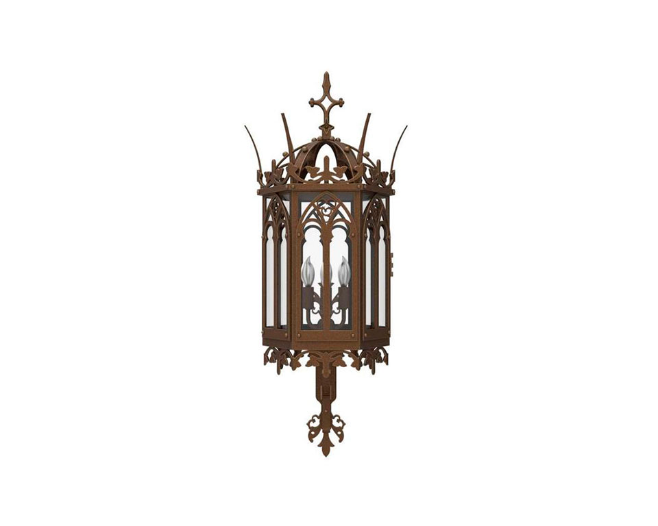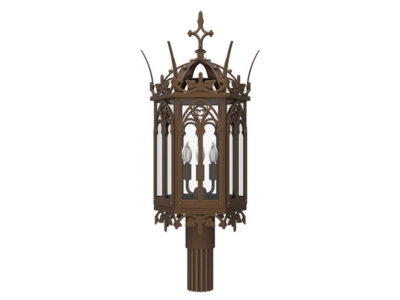 Reminiscent of the splendor of early Spain and Colonial Mexico, the word “capilla” translates in English to “chapel,” and that’s exactly what this ornate lantern resembles. With panes that mimic the windows of a church, the lamp is adorned top and bottom by a trefoil design with a cross as the finial. This custom lighting concept is a classic complement to European-style properties, making a dramatic statement at driveway entrances, front doors and other high-visibility areas.