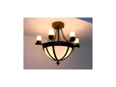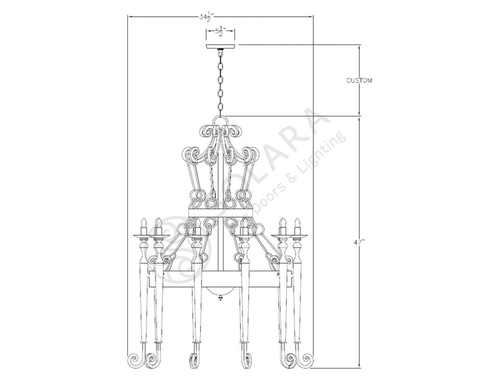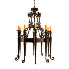 The Colonial iron chandelier is among our more old-world chandelier designs. A chain suspends an arrangement of scrolls and linking O-rings, which in turn supports a ring surrounded by candelabra with long tapers ending in scrolls. The classic style best suits a traditional residential or commercial space, including a lobby, foyer, kitchen, living room, dining room, bedroom, and more.