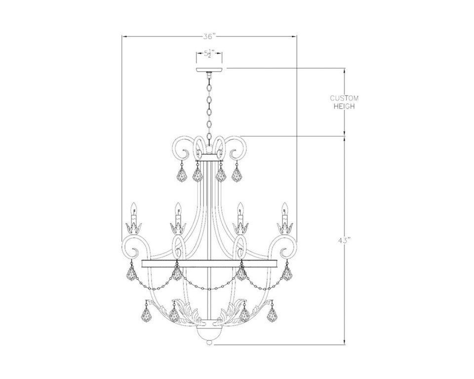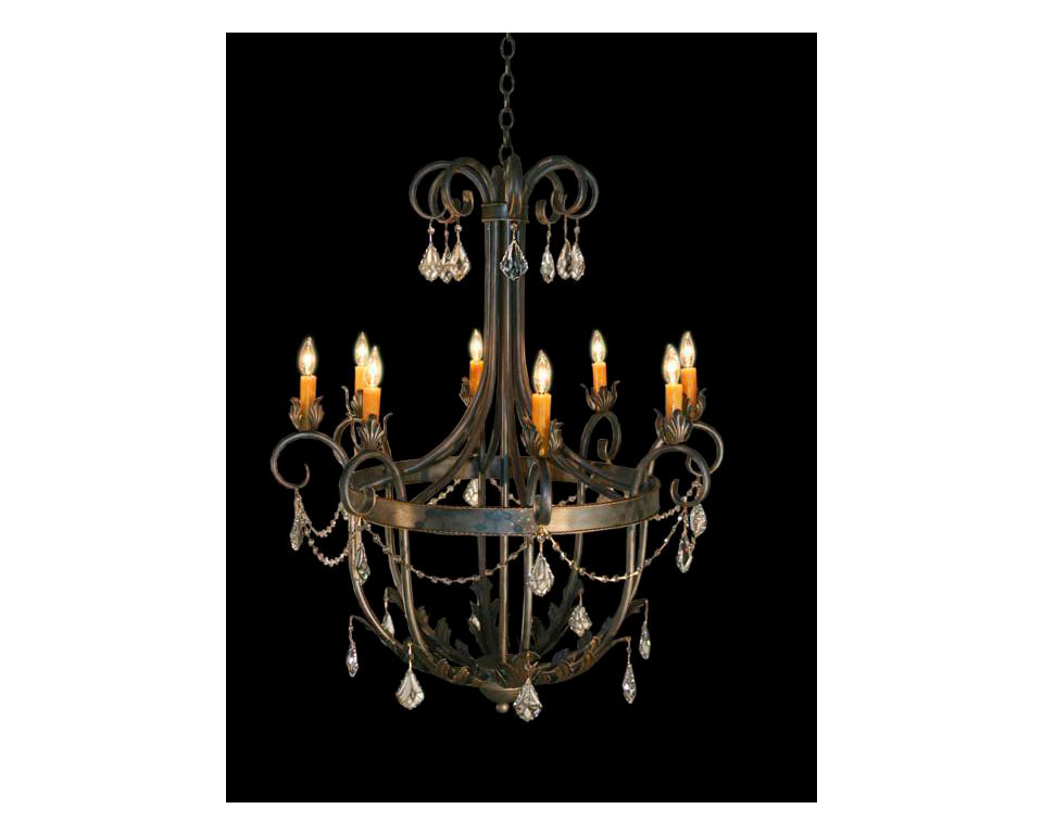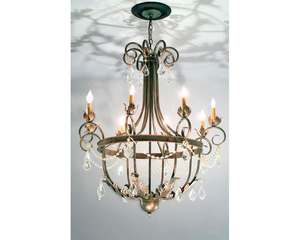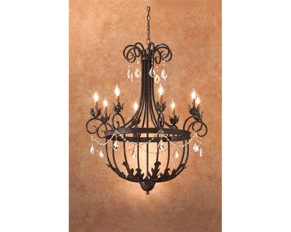 Traditional meets transitional in the Ecuador iron chandelier. With a scrollwork top, a sweeping mid-section, a ring of candelabra, a bowl-shaped bottom, and acanthus-leaf accents, this light is a little bit of everything and a lot of timeless elegance. Crystal accents take it to the next level. This chandelier suits a range of architectural styles, making a striking focal point in a lobby, foyer, kitchen, living room, dining room, or bedroom.