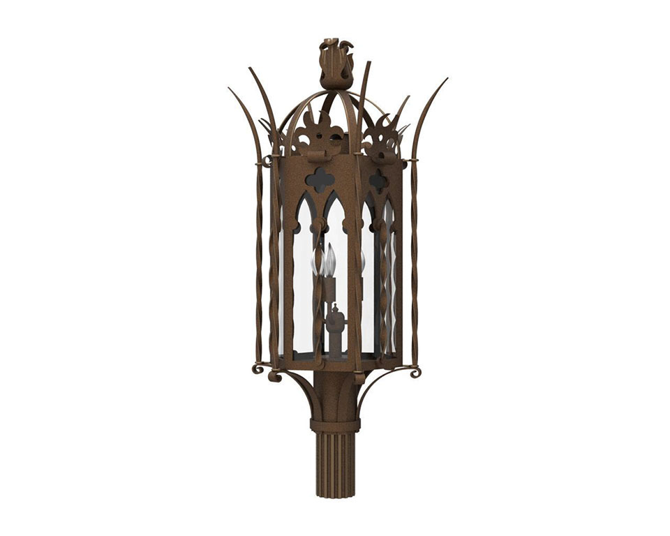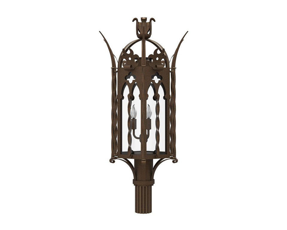 Similar in composition to our Capilla family, our Malaga custom lighting family is named after a provincial capital in Spain and brings with it the influence of old-world Spanish architecture. Showcasing a crown-like finial (which can be ordered in a contrasting finish), spikes, braids and cross-shaped silhouettes, this lantern is classic in its beauty and regal in its allure. It complements European-style buildings, making a dramatic statement at driveway entrances, front doors and other outdoor areas.