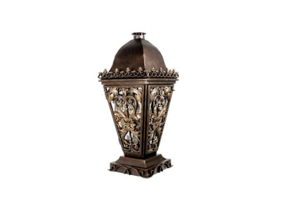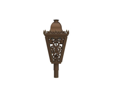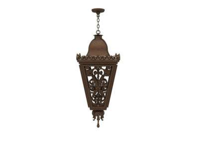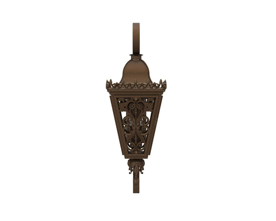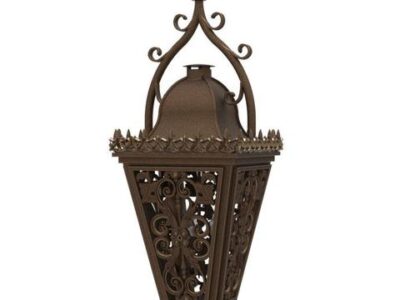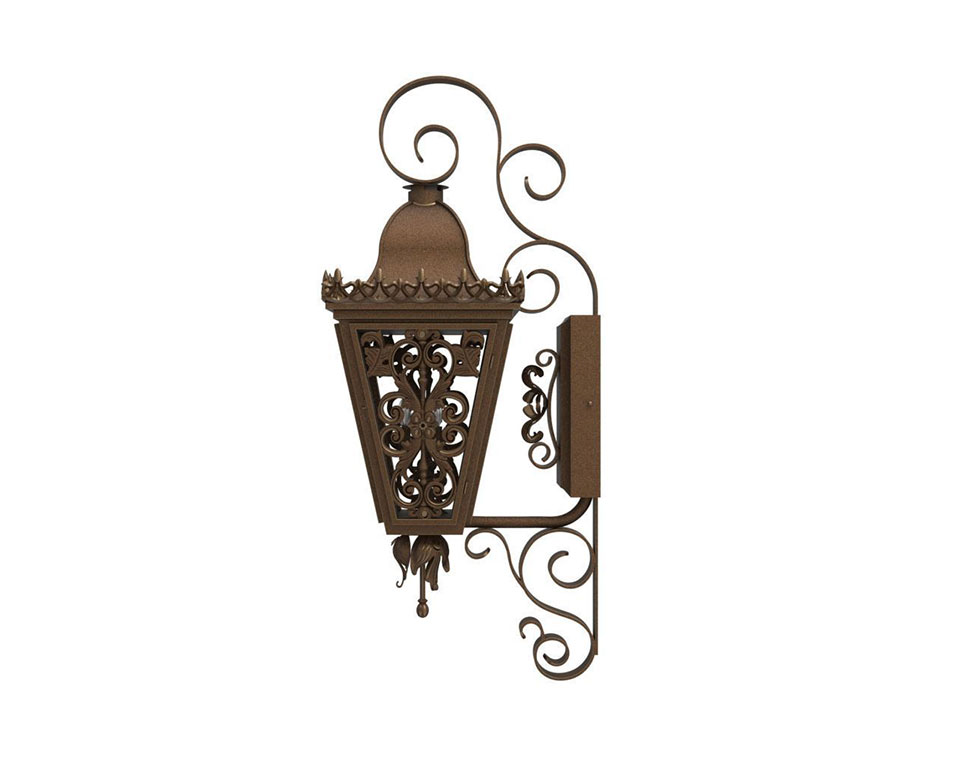 A lantern themed after the vast array of lighting design concepts appearing in Opryland hotels, including the famed Gaylord Texan Resort & Convention Center in Grapevine, Texas, the Opryland II custom lighting family is a commission for that project now available to everyone. The whimsical lantern differs from its predecessor (Opryland) in that its glass panes are overlaid with ironwork featuring a floral motif and it displays a floral bottom finial.