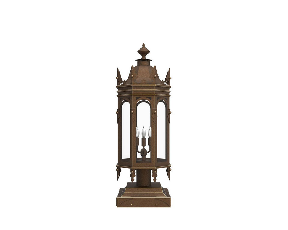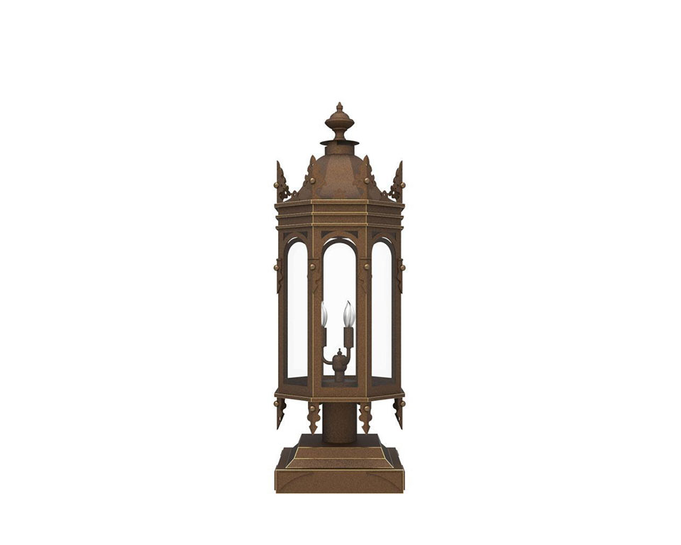 An octagonal, Spanish-inspired lantern, the Oviedo custom lighting family gets its name from the capital city of the Asturias principality in northern Spain. The style of this lantern is reserved, with spears ringing the top and bottom, a knob-style finial and a single bottom bracket with scrollwork that escalates the lamp in certain mountings. Its refined elegance is perfect for lighting driveways, doorways, patios, outdoor rooms and more in both traditional and transitional properties.
