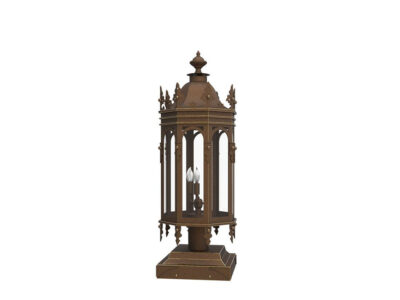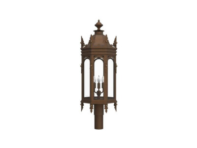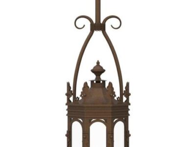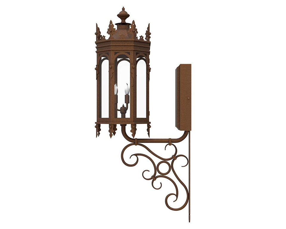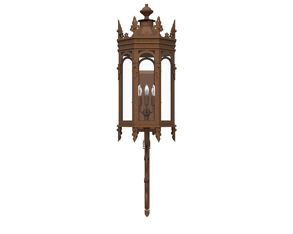 An octagonal, Spanish-inspired lantern, the Oviedo custom lighting family gets its name from the capital city of the Asturias principality in northern Spain. The style of this lantern is reserved, with spears ringing the top and bottom, a knob-style finial and a single bottom bracket with scrollwork that escalates the lamp. Its refined elegance is perfect for lighting driveways, doorways, patios, outdoor rooms and more in both traditional and transitional properties.