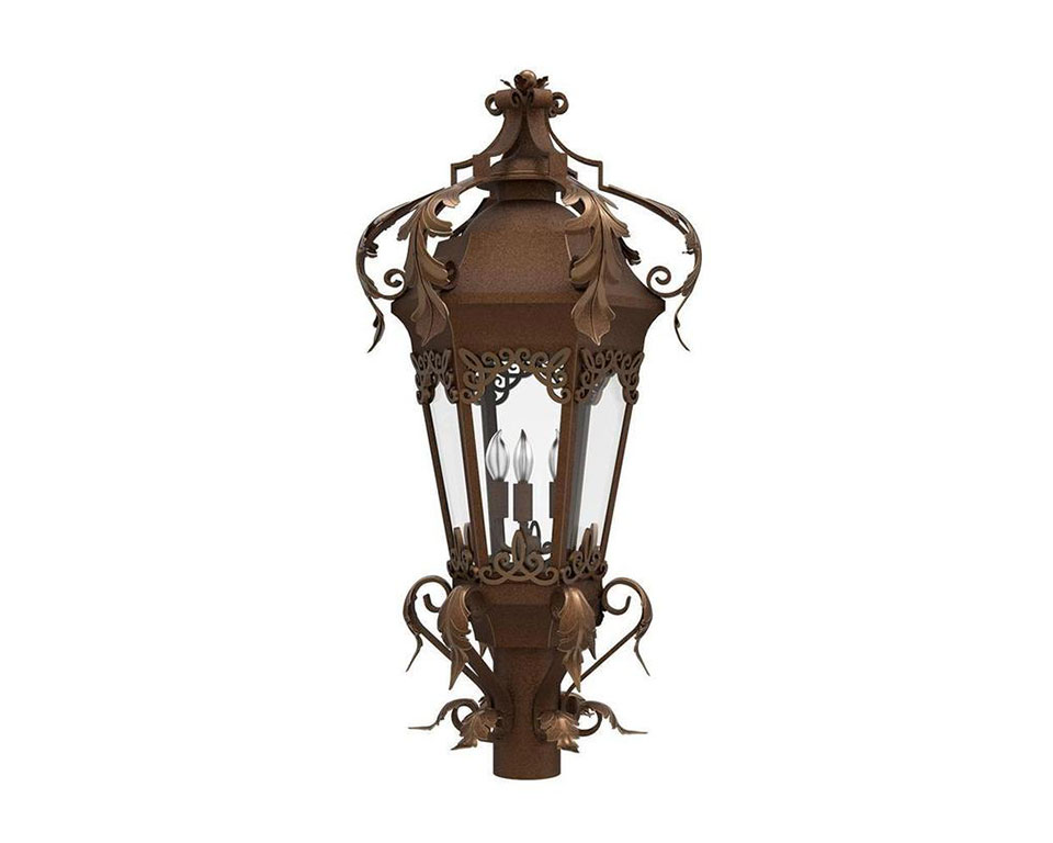 Reminiscent of a stunningly beautiful city in Mexico’s central highlands, our San Miguel custom lighting family reflects the natural elegance of that city with an abundance of organic detail. Rings of leaves cradle the six-sided lantern top and bottom, with delicate scrollwork layered over the glass for a feminine allure. This beautiful lamp is well-suited for both traditional and transitional architectural styles and is a striking addition to a driveway entrance, doorway, patio, balcony and more.