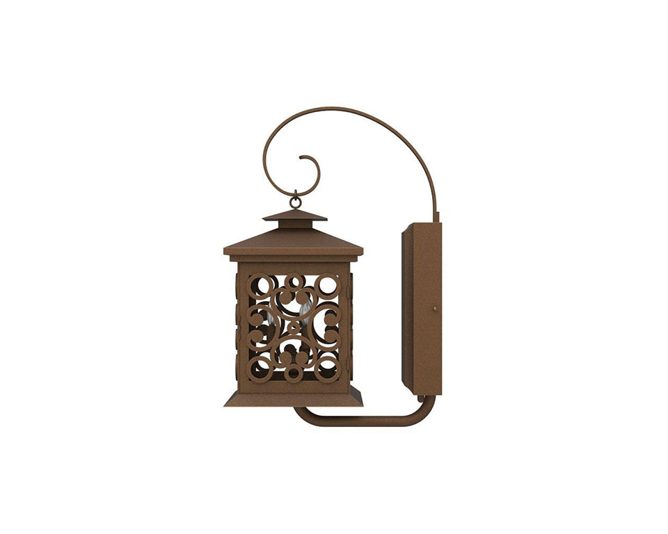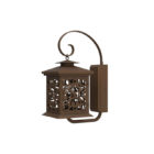 A pared-down, compact light, the Serena iron wall sconce has clean lines with an Asian influence. A single, delicate scroll holds the square lantern from the top, with glass panes that are overplayed with a flat circle-and-scroll design. One of our more unique selections, the Serena custom light works with classic and transitional architectural styles, making a subtle and charming statement at driveways and front entries, as well as on patios, pool decks, garden areas and more.