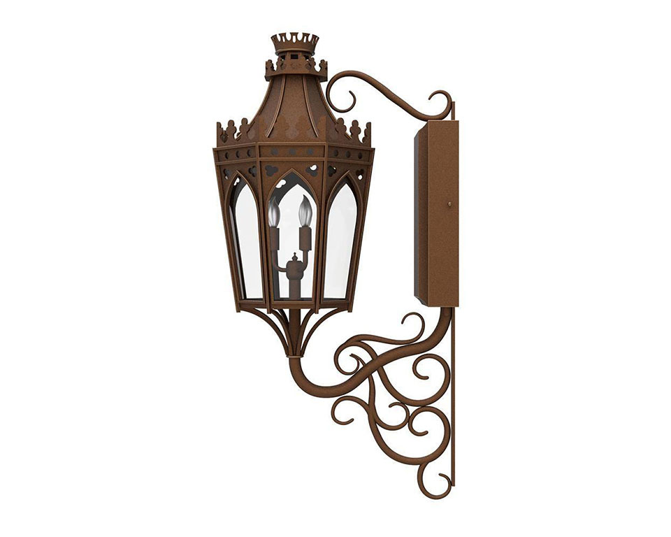 The Moroccan influence is clear in our Tangier custom lighting family with its tapered octagonal lantern, ringed by two tiers of spades, and topped with a crown. A cluster of scrolls adorns the bottom bracket (in applicable mountings), with a single-scroll top bracket creates balance. A touch of whimsy and class, this style suits both classical and transitional residential and commercial buildings. It’s an elegant statement on either side of a driveway or doorway, or on a patio or deck.