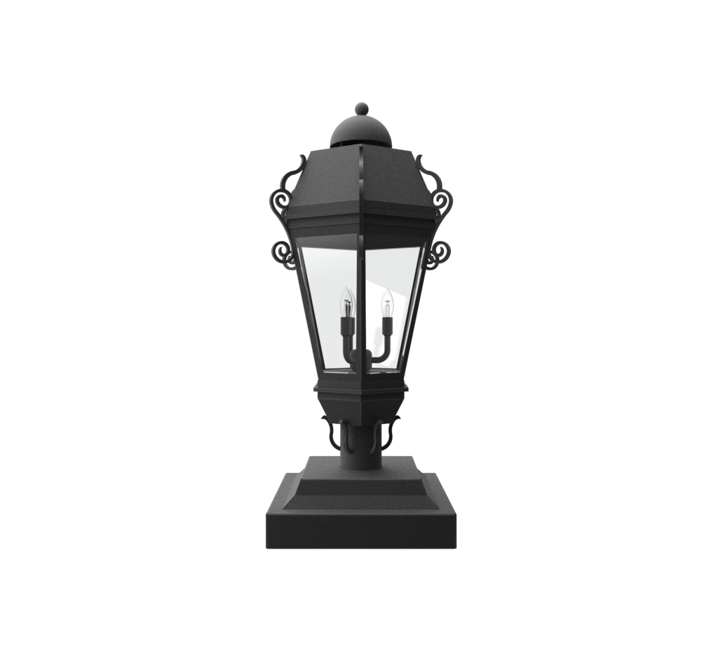 Named after Austria’s capital, the Vienna custom lighting family strikes a harmonious balance between the traditional and transitional design concepts in a beautiful way. The classic tapered-hexagon shape is lightly embellished with flattened scrollwork and topped with a domed finial, with brackets (in some mountings) that feature simple flattened scrolls. The light complements transitional properties and is suited for many outdoor uses, flanking driveways and doorways, as well as indoor use if desired.